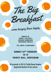 Sunday February 22nd 10.00 – 12.00am brings the return of the Shotesham Big Breakfast at the Trinity. Come along and share tea, coffee and a breakfast roll with friends , neighbours and fellow villagers. Suggested donations of £5/adult, under 12s free.
